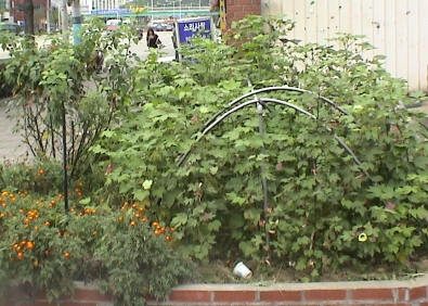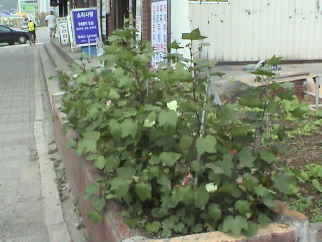 | 로터리내 의류점을 경영하는 오명주(40)씨와 송임순씨(39)가 15개의 화분에 나눠 심은 60포기의 목화가 희고, 붉은 빛을 뿜고 있어 행인들과 차량운전자들의 시선을 잡고 있다. | |